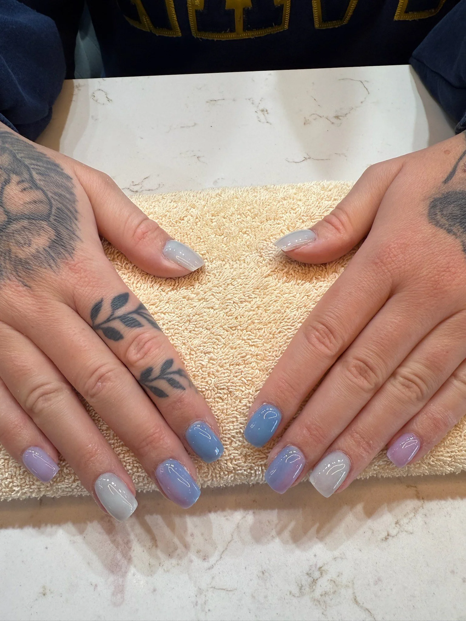Blend of two colors fading into each other. Usually recommended to do with dip than gel for a better result.